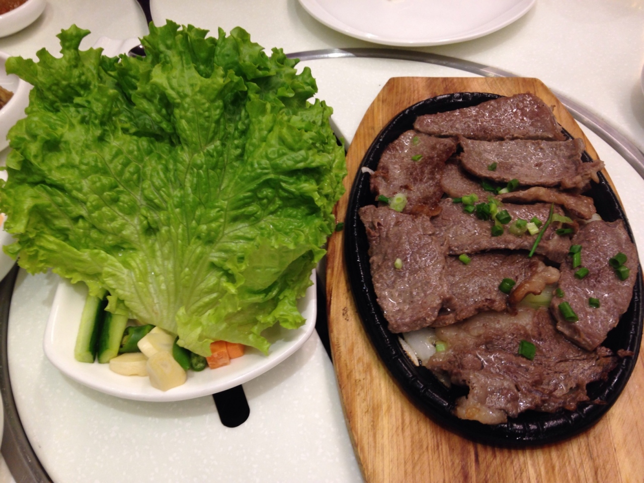 特級サーロインの焼肉、テールスープ、石焼ビビンバを頼んだら食べきれませんでした。韓国料理屋では最初に出てくるキムチや前菜の盛り合わせが豊富でお代わりも自由になっていますが、これをつまみながらビールを飲んでいると料理が来る前にお腹がいっぱいになるという難点も…。焼肉については頼めば厨房で焼いてきてくれます。お料理自体は可もなく不可もなくという感じでした。