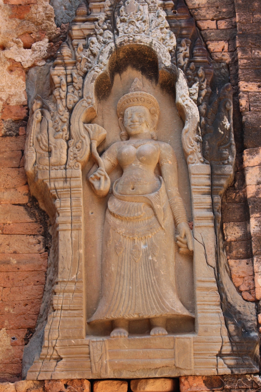 ロレイの建てられた小島の大きさは100m四方くらいです。ロレイとは王都ハリハラーラヤの名を新しくロレイと呼び替えたものです。ここが人工の小島であったことを思い出させる様に、駐車場からは高さ3mくらいの、遺跡保護の仮設の階段(下には当時の船着き場から上がる石段があります)を上がると正面にレンガ造りの祠堂が現れます。ロリュオス遺跡群の中では1番傷んでいます。