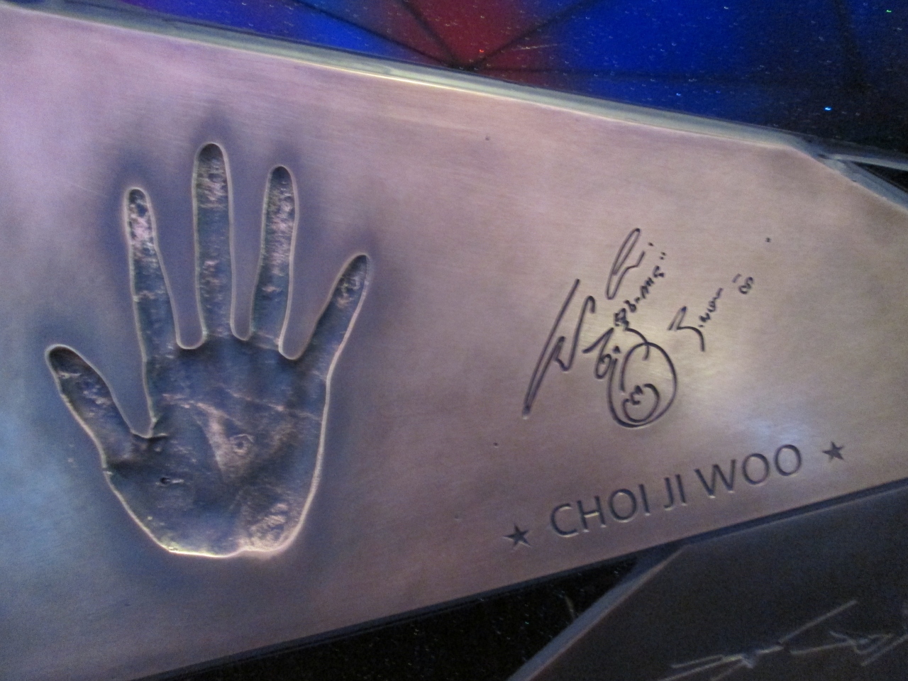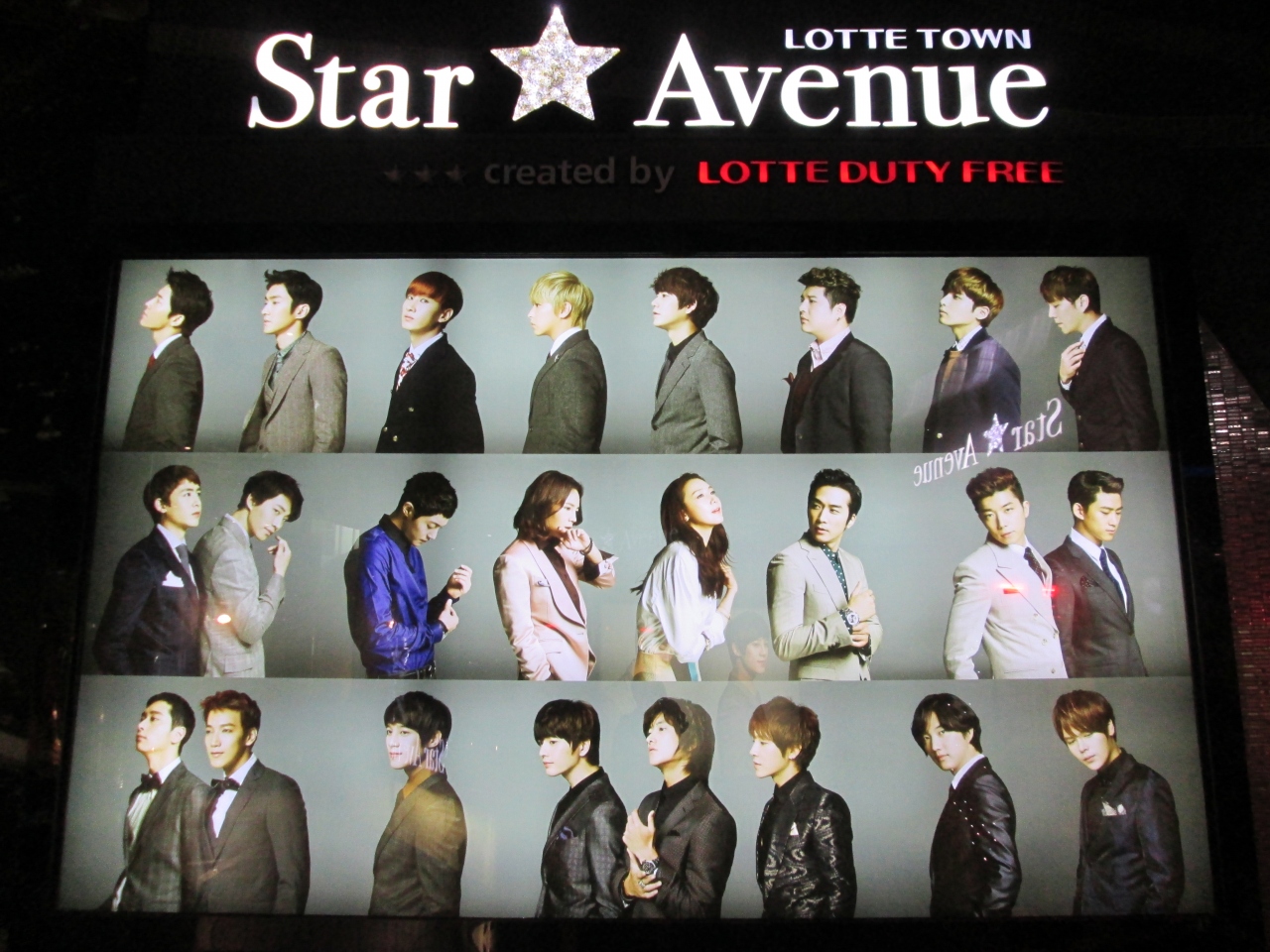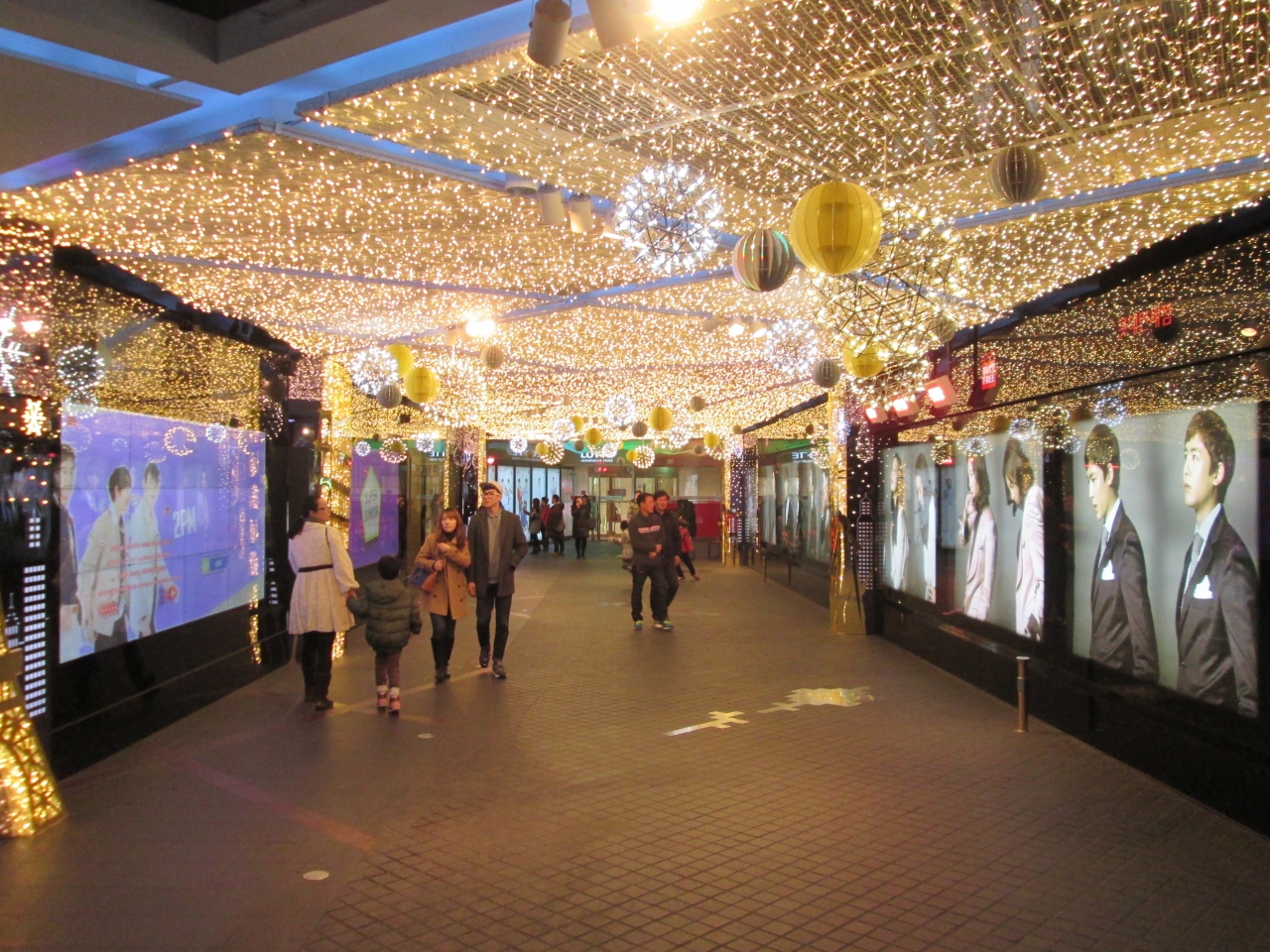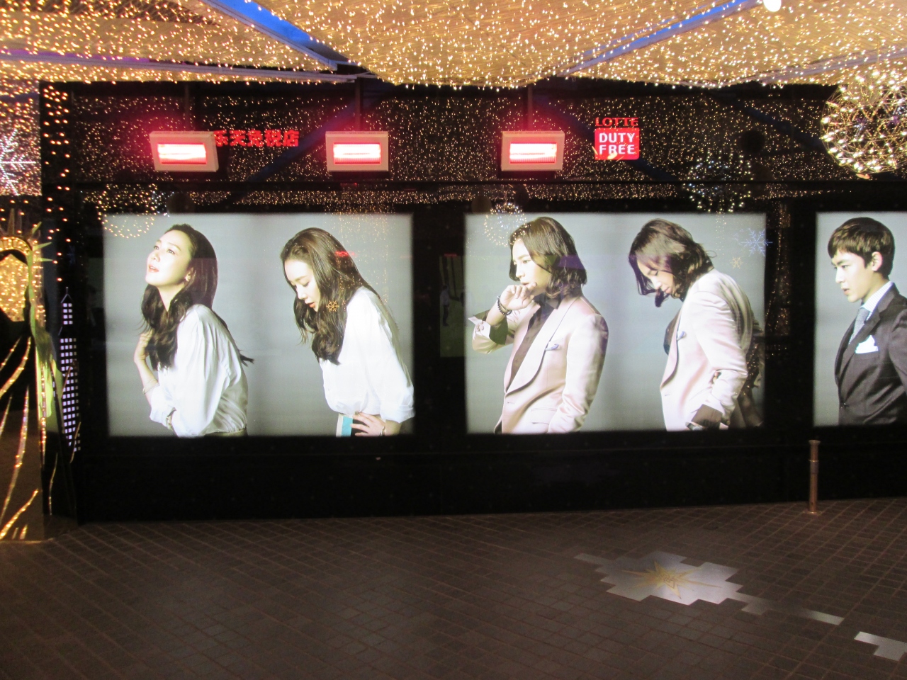 ロッテ百貨店の1階奥にあるスターアベニューです。日本でおなじみの韓流スターの写真、展示物、手形があります。音声はなかったですが、映像による放送もありました。周辺のクリスマスイルミネーションがきれいでした。