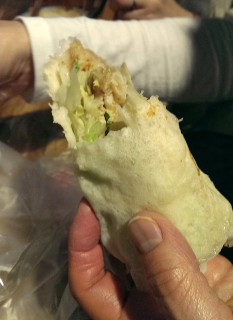 砂糖とピーナッツ粉とレタスなど野菜、などなどたっぷりの具を巻いて、最後に鉄板でちょっと温めて出してくれます。