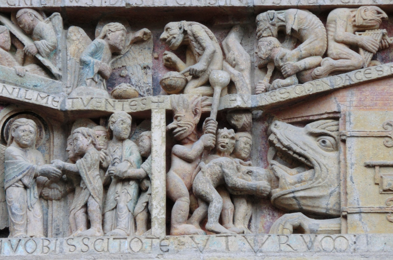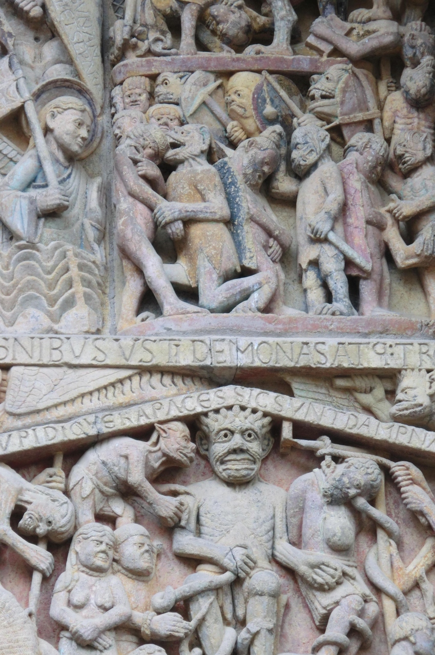 ユネスコの世界遺産に登録されているタンパンには「最後の審判」が彫られています。左側には右側の天国に召される人々と聖者達。右側には「地獄で様々な責め苦に逢う罪人達」。観光客たちはじっくりと見入っていました。