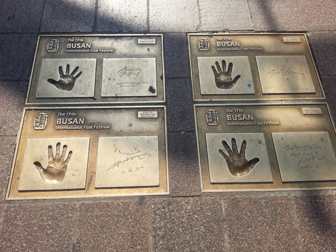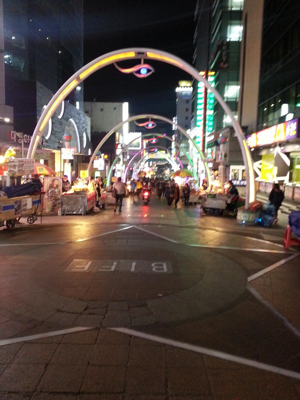 夜には屋台が立ち並び、韓国らしい雰囲気になります。チャガルチ市場から近いので、市場を見てからこの広場を立ち寄るとよいでしょう。広場の路面にはハリウッドのようにプサン映画祭で受賞した俳優の手形がうめこまれています。