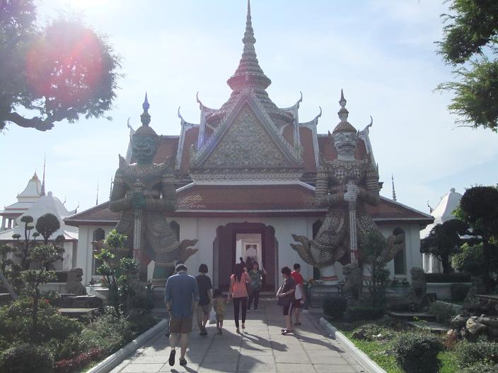 仏塔から左側には大きな2体の鬼(ヤック)がいるところが本堂の入口です。中に入っていくと、たくさんの金色の仏像がずらりと並んでいる回廊がありました。本尊にはラーマ2世の遺骨が納められているみたいです。ワット・アルン内には雑貨等のお土産屋さんがありました。