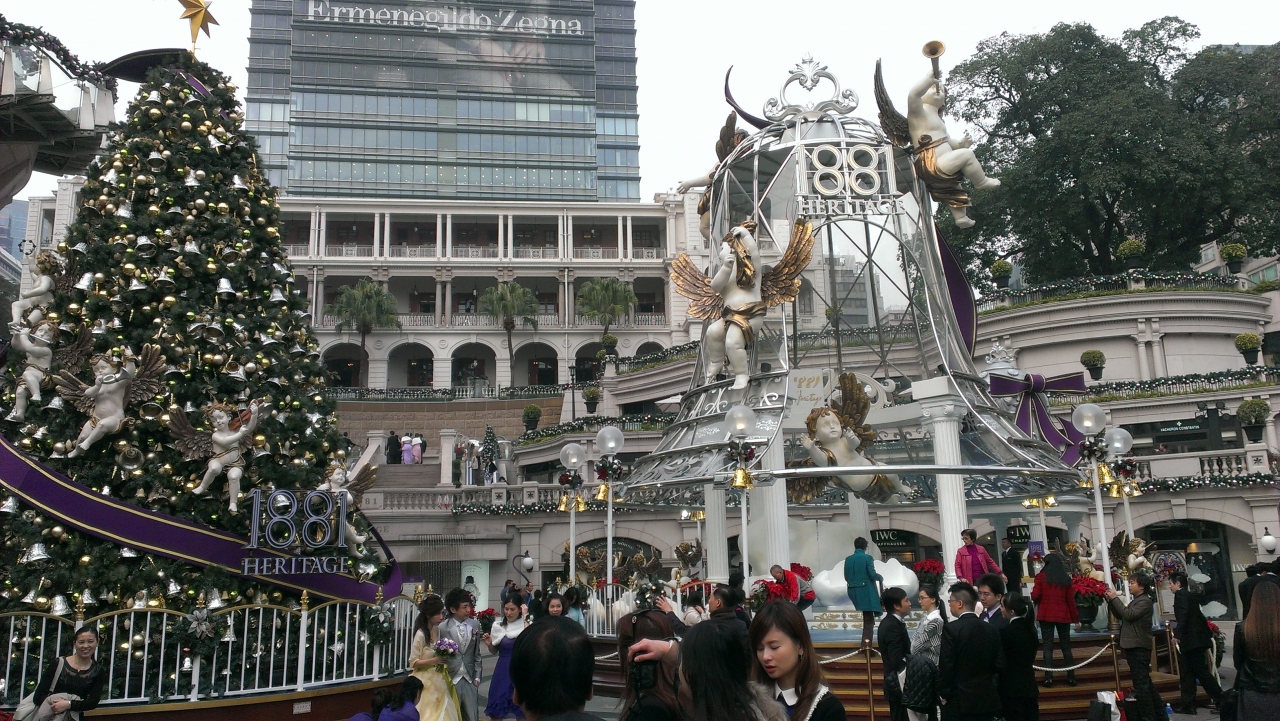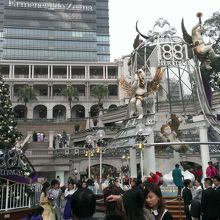 屋外のクリスマスデコレーションです。婚姻登録所が近いため、特に週末はウエディングカップルが記念撮影しています。HK$500の食券をもらえるプロモーションもありますが、購入額がHK$100,000以上なため高いハードルです。