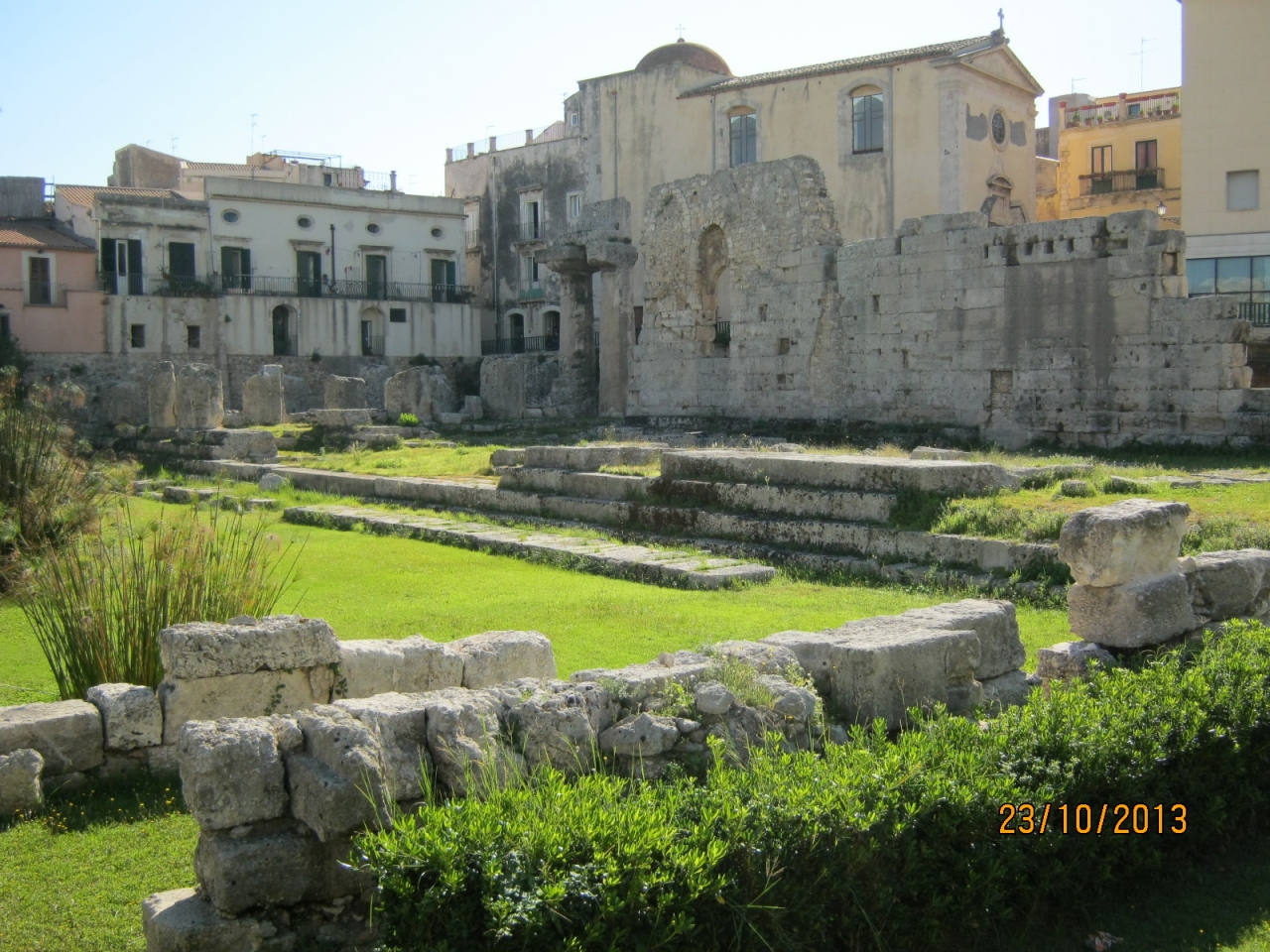 シチリアの駅から南東にあり、オルティージャ島への橋を渡るとすぐに広場があります。その一角に神殿があります。神殿はシチリア最古のドーリア式の建物ですが今は柱の一部とその上部が残っています。この神殿の北側は市場で活気があります。