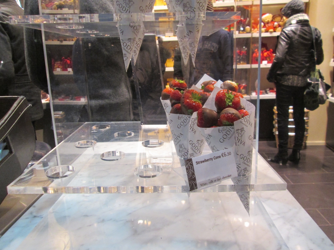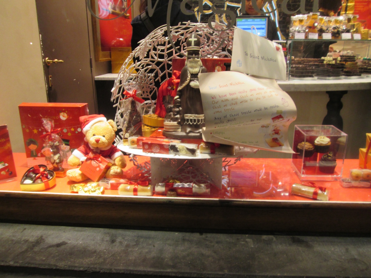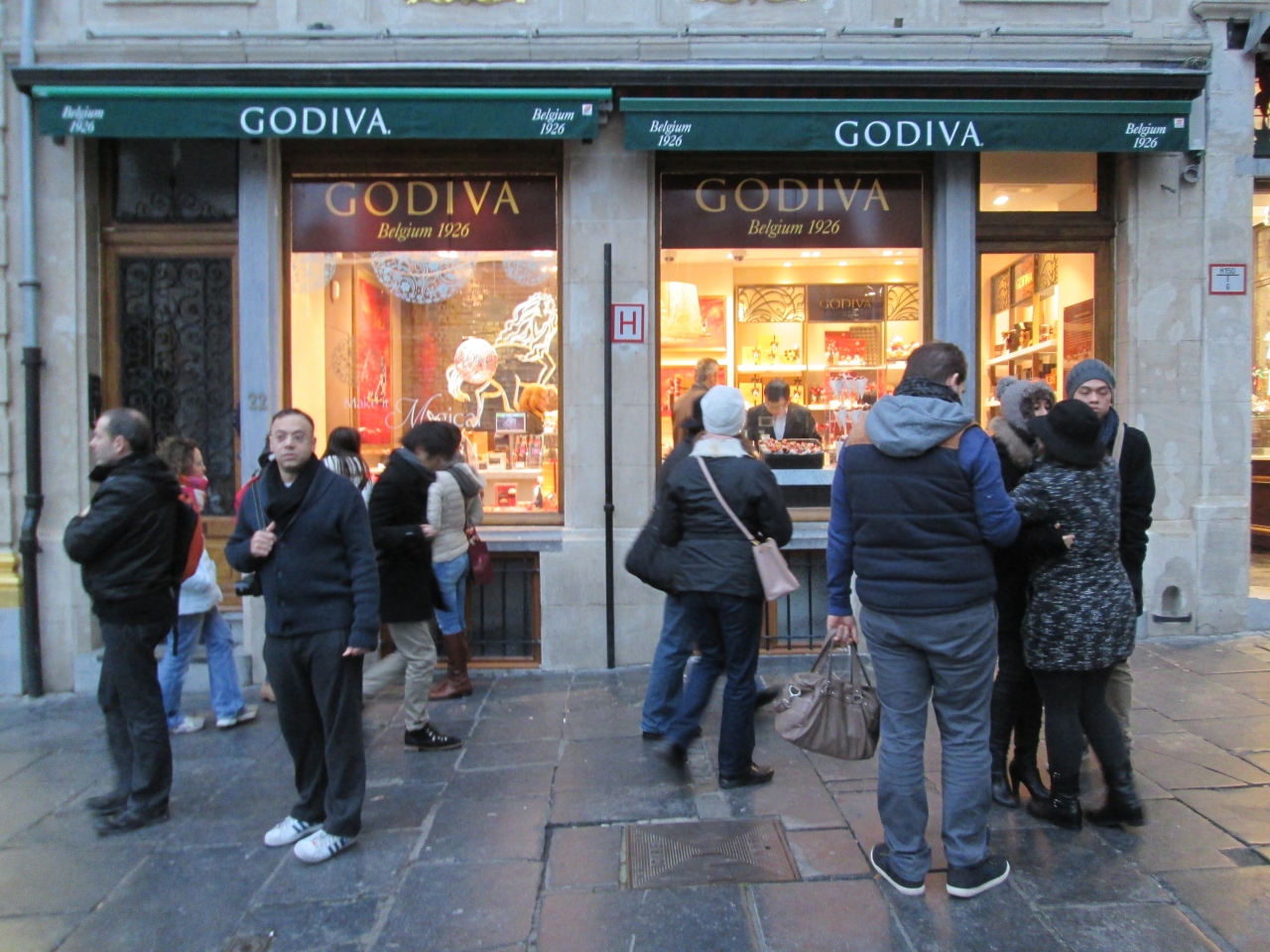 グラン・プラスの広場にあるチョコレートのお店です。入店すると店員がチョコレートを配布しており試食できました。空港で購入するよりは安く感じました。チョコレートでなく、ディスプレイされているチョコレートでコーティングされたイチゴが人気商品のようでした。