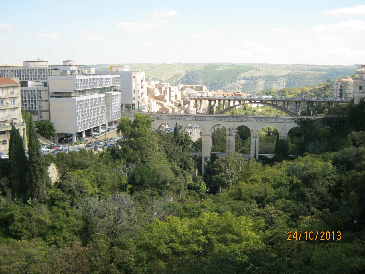 ラグーザ駅のある高台からラグーザ・スーペリオーレ地区にかかる3つの橋の中で一番古い橋です。古代のローマの水道橋のような橋です。渓谷は深いのです。その深い渓谷に石を積み上げた橋げたのある橋です。わたっているときはそのすごさを感じられないです。
