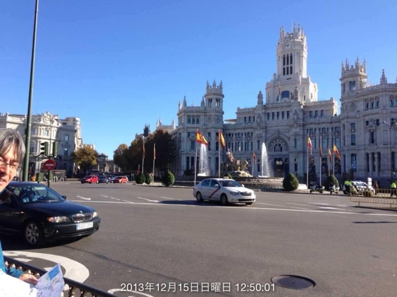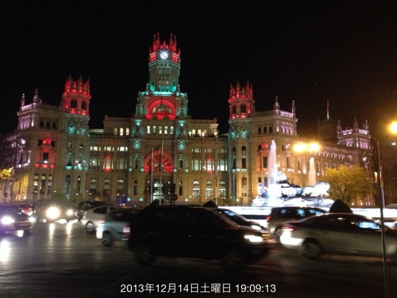 真っ先に目に入ってきて、美しいのが市庁舎の建物。しばし佇み、写真に収めたくなります。前の噴水を囲むロータリーの反対側から撮影する人が途絶えません。折しもデモ行進で警察が出ていましたが、建物の素晴らしいのに見とれました。夜は赤と緑のクリスマスのイルミネーションになっていました。空港バスの発着地点で、最初に見て感動しました。地下鉄Banco de Españaがあります。