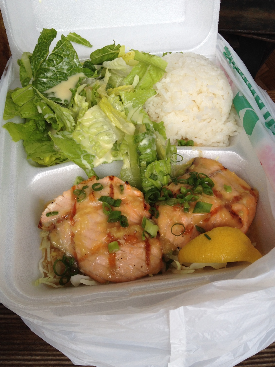 サーモンのグリルとサラダとライスを頼んで、お店の前のベンチで食べました。