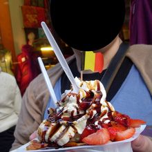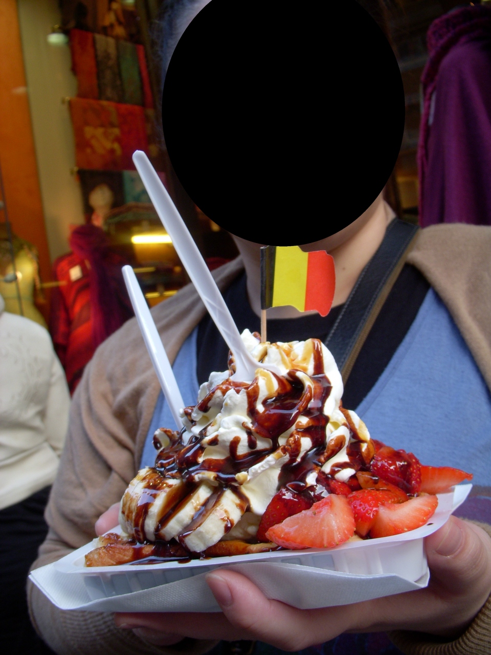グルメ界隈があります。若者も非常に多くて、にぎわいのある地区となっていました。レストランや出店などがあるのですが、レストランは結構お値段がはるということで、今回はやめにして、ベルギー名物ワッフルをいただきました。甘すぎて美味しかったです。