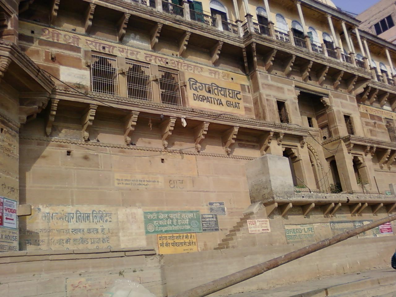 ディグパティヤー・ガートは、見事な彫刻がほどこされているガートです。規模も大きく、多くの人達が行き交っています。前の水際では、ボートの客引き達がひっきりなしに声をかけてきますが、相手にしているとキリがないので無視しましょう。
