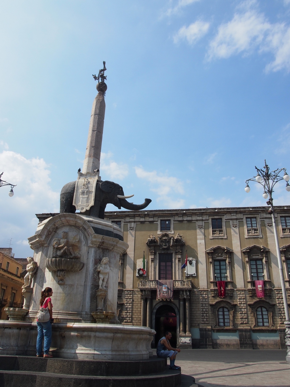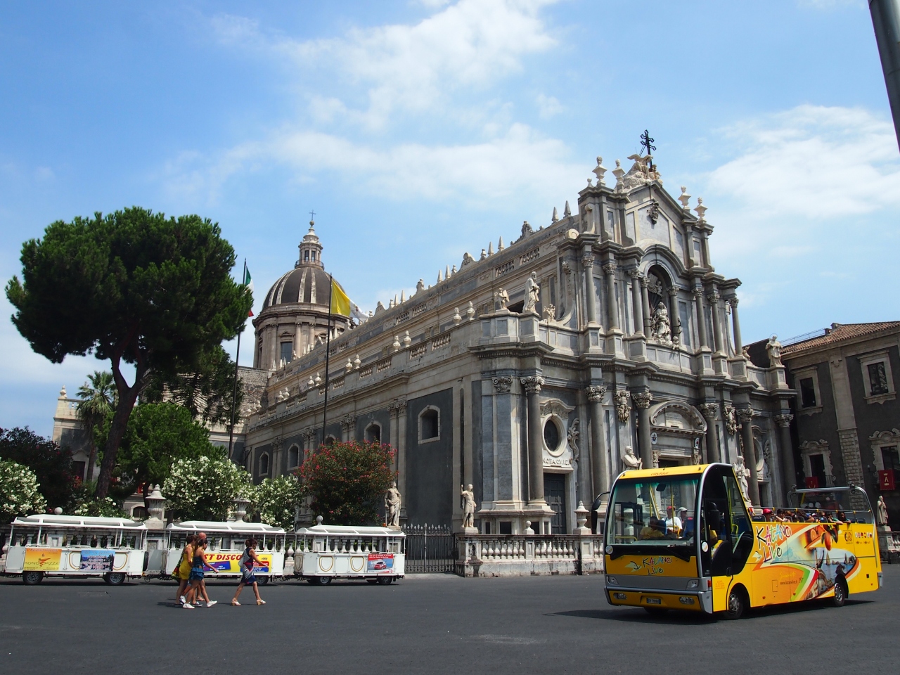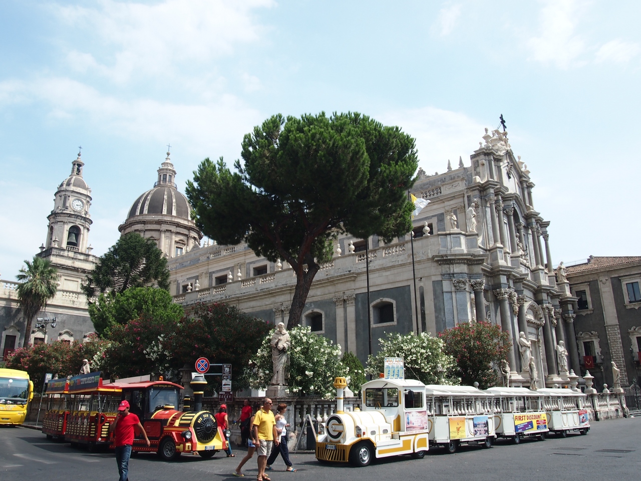 カターニアのシンボルとなっている象の噴水(エトナ山の溶岩やエジプトのオベリスクが使われています)や、バロック建築の美しい建物が建ち並んでいる広場です。観光列車(ミニトレイン)もとても可愛くて、広場と調和しています。