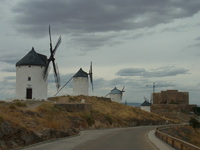 ラ・マンチャ地方のコンスエグラの丘に11基の風車がたっている。観光用で今は稼働していない。白いシンプルなデザインで、オランダの風車とはまた違った趣があった。あいにく空模様が悪かったが、青い空がバックだったら絵になるだろう。一本道に連なって一直線に並ぶ様子は雄大でよかったが、丘をくだって見上げた時、街のなかに風車が自然に溶けこんでいる光景もまたよかった。