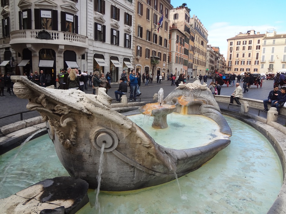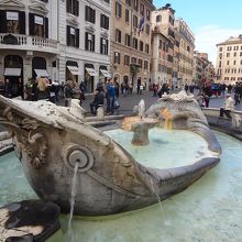 スペイン広場の中にある小舟の形をした噴水をバルカッチャの噴水と言います。テヴェレ川が氾濫したときに小舟がここまで辿り着いたということからこの形の噴水になったそうです。