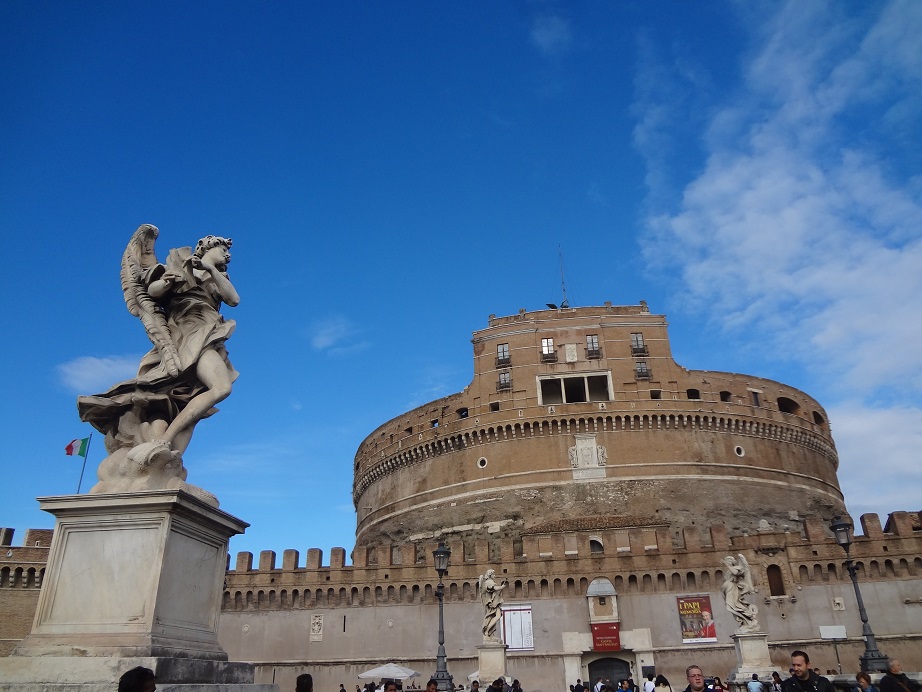 現在は国立博物館となっているサンタンジェロ城。ローマの休日でアン王女が追っ手の男たちを相手に活躍した場所でもあります。その正面にあるテヴェレ川にかかるサンタンジェロ橋も有名です。