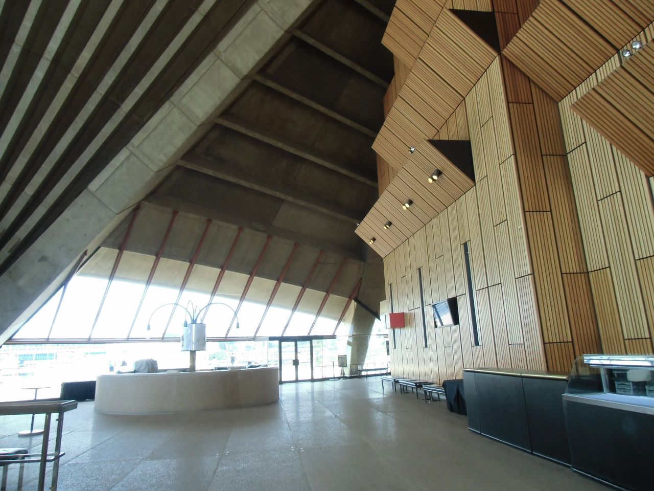 世界遺産としてもあまりにも有名なオペラハウスですが、どうやってあの形の劇場を作ることになったのかなど、その歴史を全く知らなかったので、オペラハウス日本語ツアーに参加しました。チケット売り場は、オペラハウスの地階フロアで、少しわかりにくい場所ですが、オペラハウスショップという、おみやげやさんのすぐとなりです。私は13時15分の回に参加しましたが、参加者が1人だったのでプライベートツアーになりました。最初にオペラハウスの建設物語のビデオを見せてくれます。オペラハウスを設計したのはデンマークのヨーンという建築家で、彼はオペラハウスの完成を見ることなくこの世を去った話もここで聞きました。ホールの中は写真撮影禁止ですが、外は撮影できます。オペラハウスは、主にオーケストラの公演をする劇場(海に向かって左)とオペラを公演する劇場(右)の2つがあり、オペラのホールが公演中のため、オーケストラのホールを見学しました。コンサートホールの構造など面白い話をいろいろ聞くことができて満足でした。
