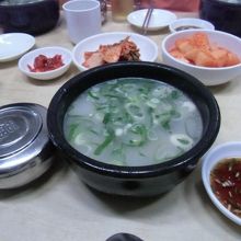 トガニタンという牛肉の軟骨を煮込んだスープ。長時間煮込んだ軟骨は、コラーゲンたっぷりでプリプリ。その軟骨や肉は、醤油ベースのタレに付けて食べます。白いスープで、味はソルロンタンに似ています。