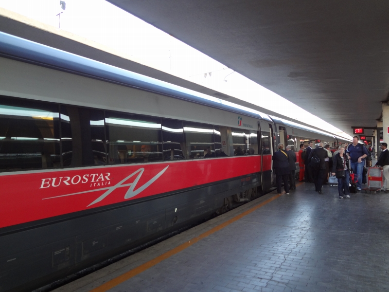 イタリアの特急はデザインがいいです。1等車は椅子が革張りでふかふか。とても快適でした。飲み物のサービスもあります。切符は駅で買うよりも、事前にインターネットで予約すると安いチケットを買えることがあります。遅れはあまりありません。