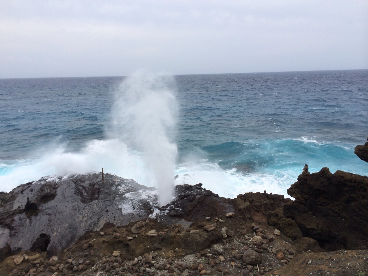 ホノルルからダイヤモンドヘッド方面に海岸線に沿ってカイナルビーチに向かう途中で寄ってみました。いつも岩穴から海水が噴き出ているとは限らないそうですが、うんがいいと、波の力で海水が噴き上がるのが見えます。私がみたブローホールは写真のごとく波が荒く、吹き出ていましたが、もっと凄く噴き出るのか、Peekに近いのかは不明。
