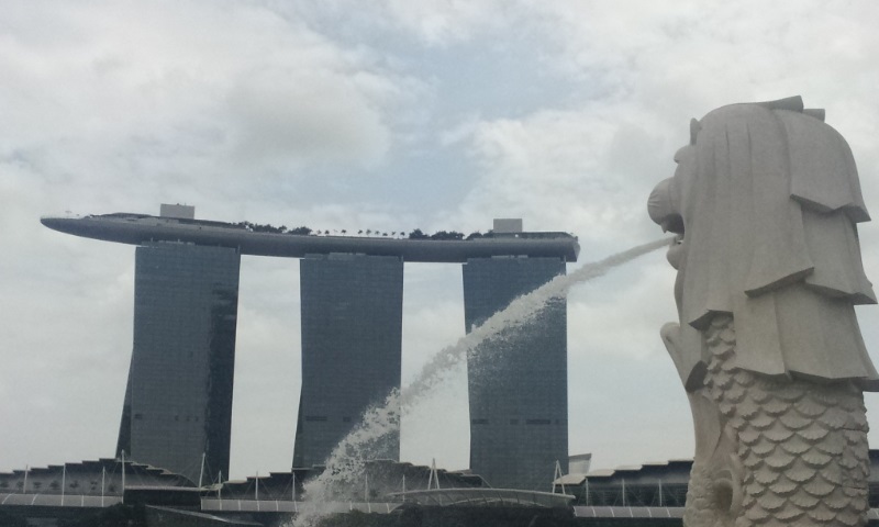 マーライオンをバックに面白写真を撮ろうとしている人が