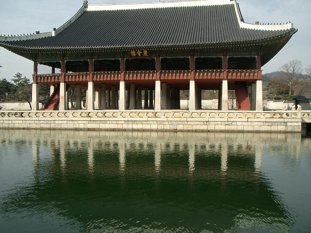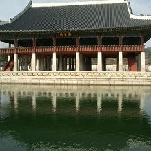 景福宮の中央左手の池に造られた楼閣です。王が海外からの使節を接待したり、臣下と宴会をした場所です。4月から10月までの期間限定で拝観できるのですが、私が行った3月は池越しに見るだけ。それでも池の中に調和した重厚で優雅な光景は一見の価値がありますよ。