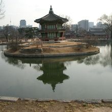 景福宮の最奥部(北)にある池上楼閣です。1867年に高宗が建設した楼閣で、王が周りの景色を見ながら散歩を楽しんだということです。ただ、私が行った3月はまだ冬枯れの景色で景色を楽しむことは出来ませんでした。でも、池や楼閣の周りには多くの植樹があり、春~秋は新緑・花・紅葉と、それぞれの美しい光景を見ることができますよ。