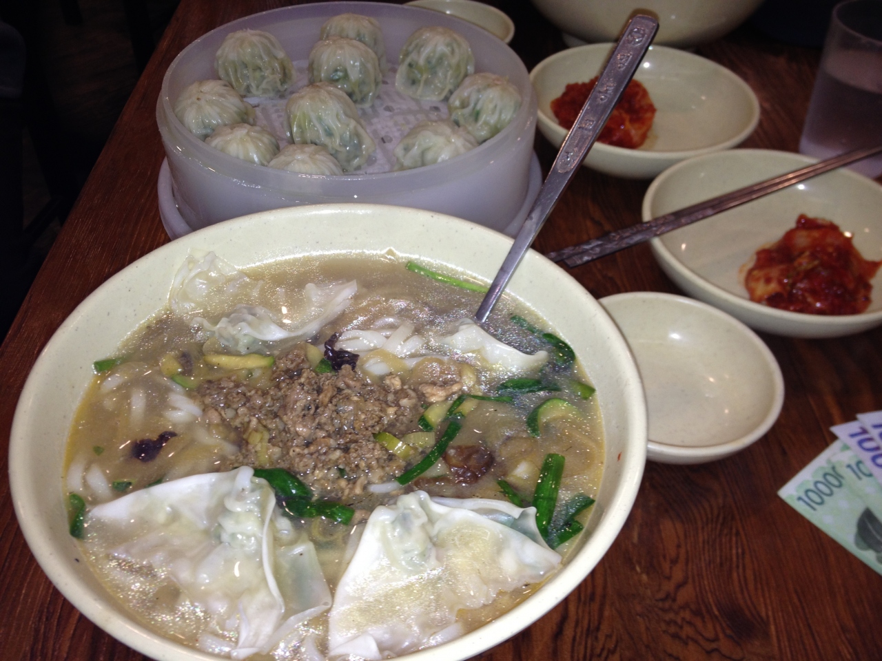 明洞餃子は3回目で、カルクッス2つマンドゥ1つを頼みました。変わらない美味しさに大満足。ただ、カルクッスの量が多いので、2人でシェアしてもよかったかも…隣の地元の方は人数分頼まずに、麺のおかわり(無料)をしていました。店員のお兄さんが「おかわりは?」って聞いてくれました。食べきれないので断りましたが、そんなサービスがうれしいですね。キムチは以前ほど辛く感じませんでしたが、私が辛さに慣れたからかも…キムチも相変わらず美味しかった。会計は店員のお母さんがテーブルを廻ってしてくれます。私が小銭を一桁まちがって出して「すみません」と出し直したら、笑われましたが明るい感じでよかったです。
