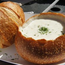 二人分以上あるような…巨大なパンにクラムチャウダーがたっぷり。