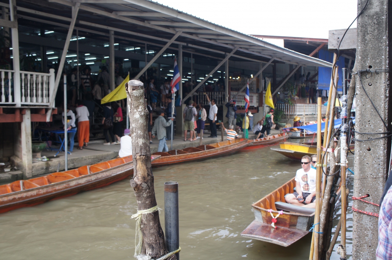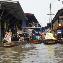 水上マーケット地区に到着すると、お土産センターのようなところで下り、その後手漕ぎボートに乗って、日本でいうお城の堀のようなマーケット地区をぐるりと回ります。