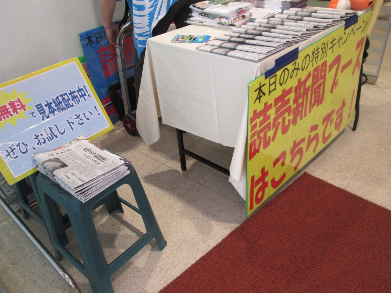 フジスーパーに行くとバンコクでの物価の確認を行います。次に、入口2カ所にフリーペーパーのコーナーがあり、滞在中の情報収集のため、もらいに行きます。訪問した日は入口付近で読売新聞のサービスを行っていました。