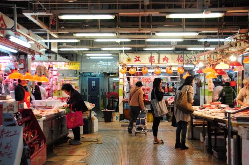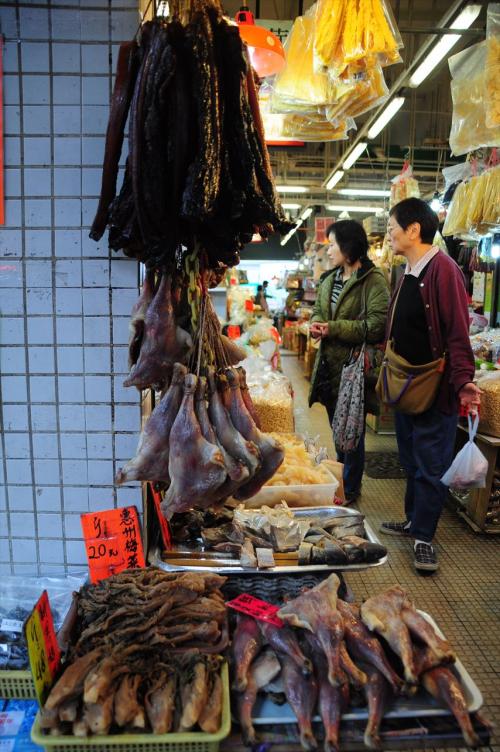 北角の船着き場から歩いて飲茶店に向かう途中、街市があったので、少し見学しました。1階が乾物や生鮮食料品を売る市場、2階にあがると食堂もあります。ちょうど雨の日で、結構寒い日だったので、あまり人がいませんでした。船着き場だけでなく、MTRの駅もすぐ近くなので、交通は便利です。市場好きにはお勧めです。