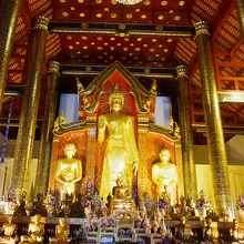 チェンマイのお寺の中でも、キラキラ度はかなり高めです。中は天井が高くて広いです。裏手には地震で崩れた仏塔があり、それも見逃せません。象の彫刻がぐるっと置かれているのが印象的でした。裏手の小さくて黒っぽいお堂の装飾も美しかったです。