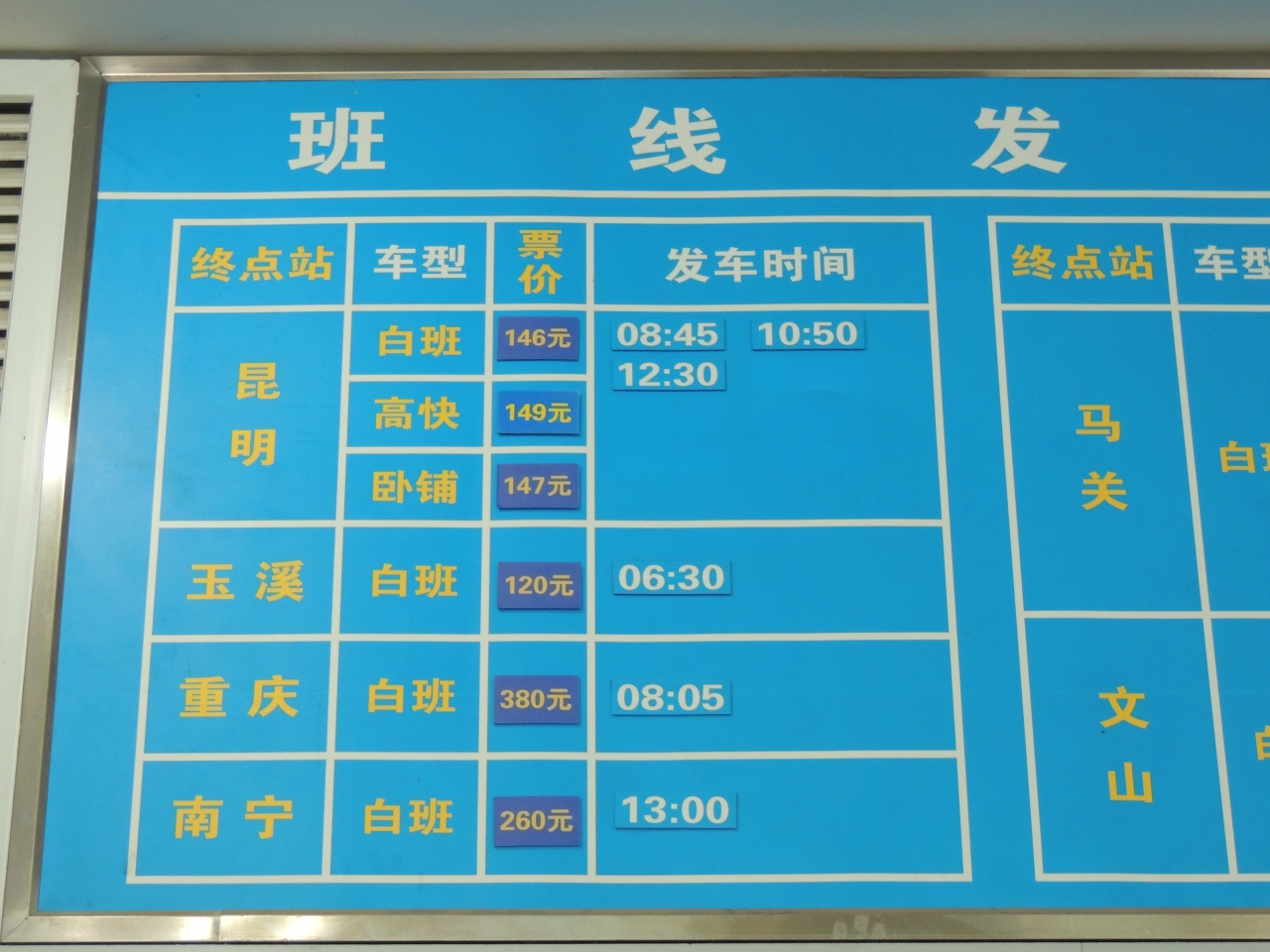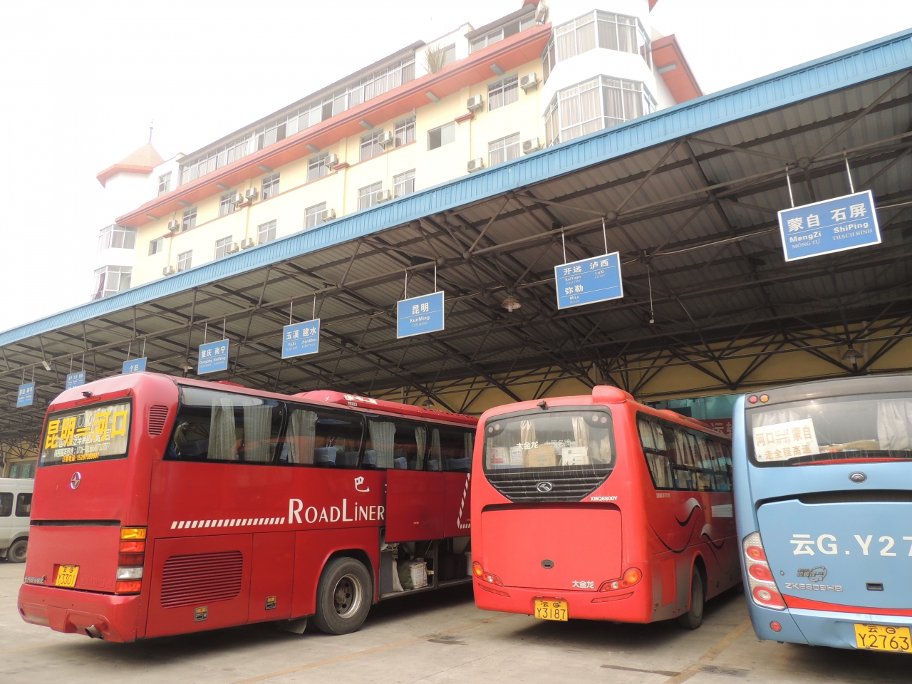 ベトナムから中国へ北上される旅行者は国境を越えた中国側の街、河口から昆明を目指す方も多いはず。そんな方のために、いかに河口から昆明に行けるか、お伝えします。まず、河口の街から5キロほど離れたバスターミナルに行くことになりますが、そこまでは緑色の市内バスで移動。料金は1元で、入り口近くに設置されたボックスに入れるだけ。およそ15分ほどでバスターミナルに到着します。そこで昆明行のチケットを買いますが、値段は150元弱です。バスは昼くらいまでと、あとは夜行になります。およそ7時間で昆明の東部バスターミナルに到着します。移動は高速道路を利用するので、道もスムーズで快適です。乗客も基本的には車内でのマナーもだいぶ改善されて、喫煙もしません。中には非常識な客もいるかもしれませんが。。。では、どうぞ快適なバスの旅を!