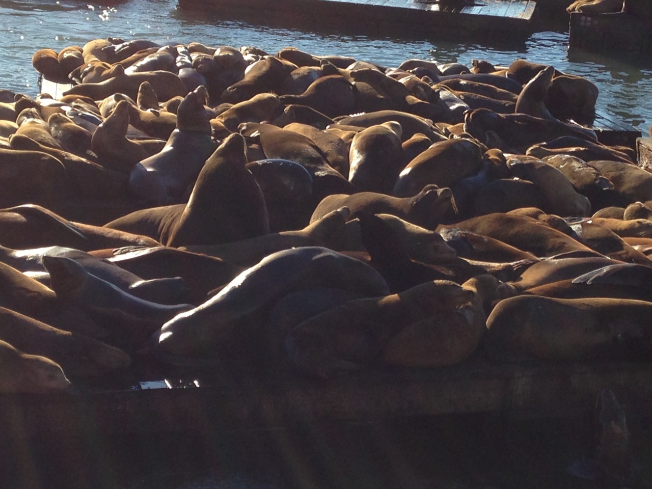 お土産屋さんとレストランがたくさんあります。お土産屋さんはフィッシャーマンズワーフの前の通りのほうが同じものでも安いです。アシカがこれでもか!というほどいました。日向ぼっこする木の台に入りきれず押し合いをするのが見れました。