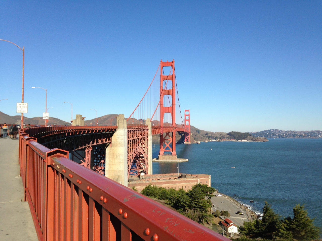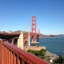 結構長いです。バスで何度か往復しましたが上、前、横のどこを向いて素晴らしいです。アルカトラズや市内が見渡せます。夜はライトアップされてきれいです。バスの運転手に歩いて渡ると30分と言われ、とても寒い日で途中で疲れても歩き切るしかない場所なので歩いて渡るのはあきらめました。