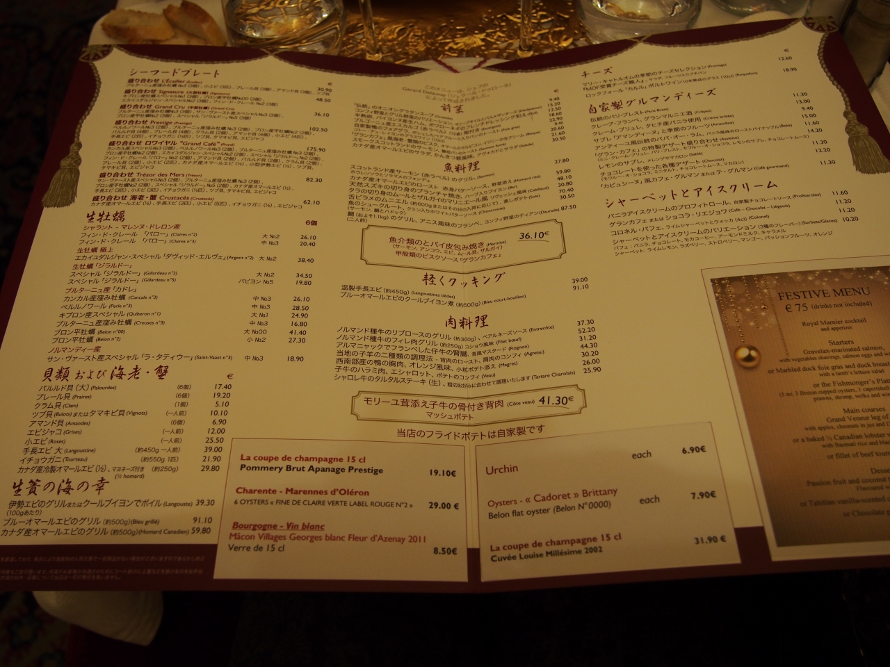 夜のロワシーバスを利用する方で、遅くまで開いている&日本語メニューが欲しい方におすすめです!メニューの写真を参考までに載せておきます^^