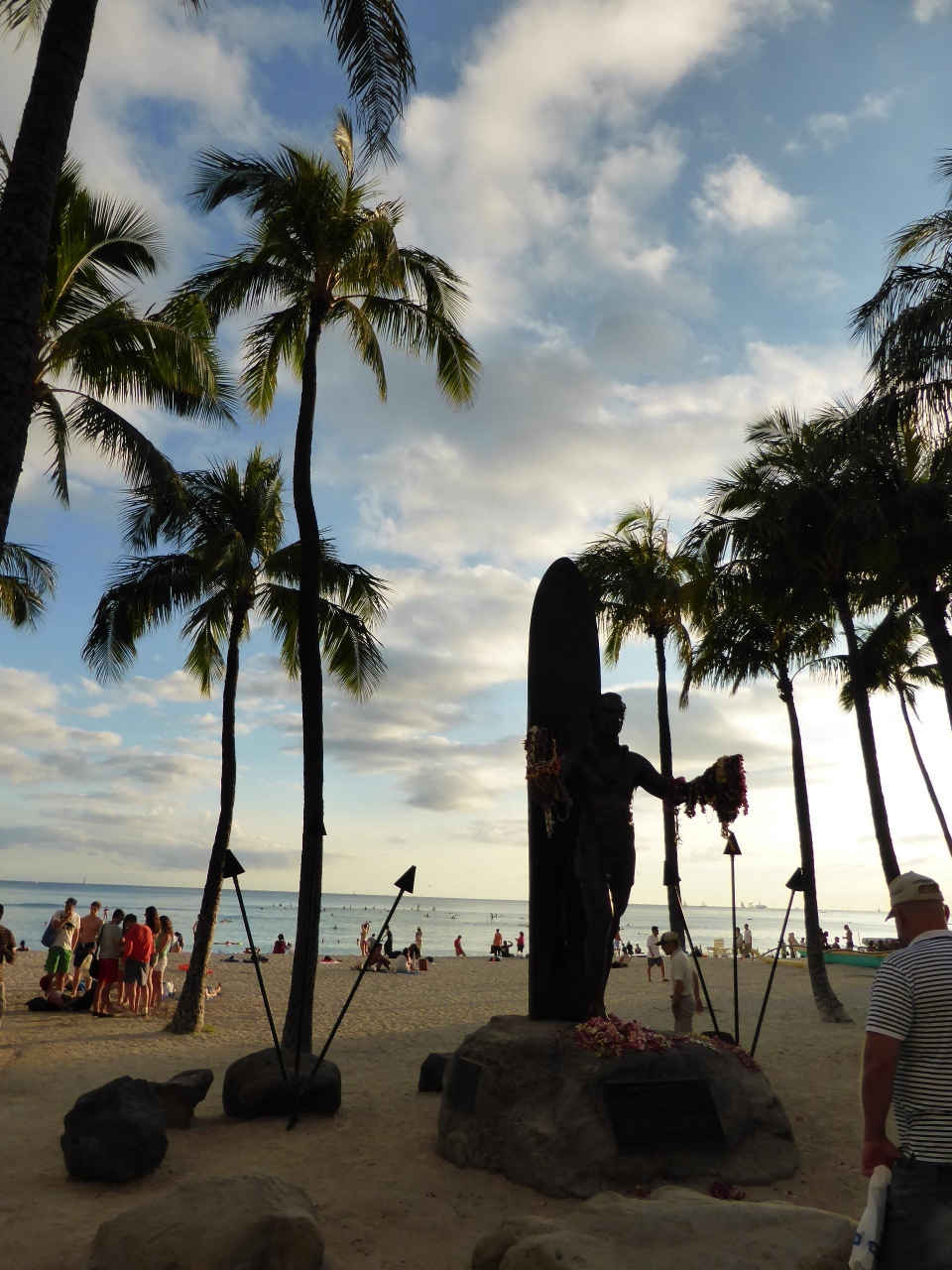ハワイといえばワイキキビーチ。デューク・カハナモク像にはいつも両手にレイがかけられていてワイキキビーチのシンボルとなっています。いつも人で溢れているのでビーチの場所取りをするなら朝早く行ってビーチタオルやゴザをひいて場所取りしてください。