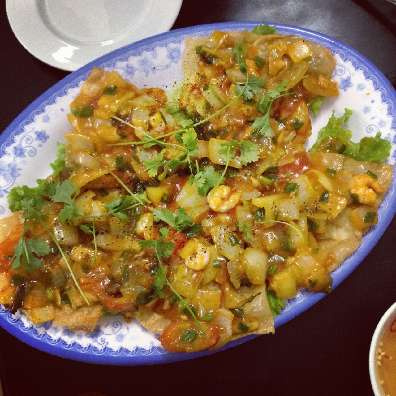 ワンタンのような米粉で作られた生地の上に、海老のすり身や揚げたニンニクが添えられている。あわせて、上げワンタンもいただき、両者の味の違いを楽しむことをお勧めする。