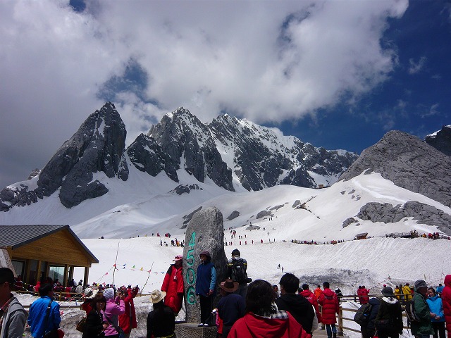 7路バスで行くことができますが、席が埋まるまで発車しませんでした。途中ゲートで入山料(150元)と古城維持費の領収書も提示を求められましたが、私たちはまだ麗江古城維持費を払っていなかったので、ここで80元払いました。バス代は15元でした。玉龍雪山のビジターセンターのある、甘海子でバスを下車。まずバスとロープーウェーの券を購入。ロープーウェー150元+バス20元。ロープーウェーを下りると4500mの世界なので空気が薄く、ものすごくゆっくりしか歩けませんでした。売店で酸素ボンベを買って吸うと一時的に呼吸が楽になりました。雪山ではそり滑りもできました。寒いことは寒いですが、ちょっと外を歩く分には真冬の格好をしなくても大丈夫でした。