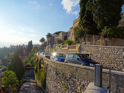 ★タオルミーナの城塞 町全体がこんな感じで囲まれています。この城塞の外には、イオニア海があり、遠くにエトナ山が望めます。ここは、市民公園からのぞむ夕方のイオニア海沿岸の城塞です。体感的に実感するには、カステルモーラへの坂道、または階段をのぼっていくといい、と言われましたが、かなりの体力を要します。私は、タクシーを利用して上へあがりました。