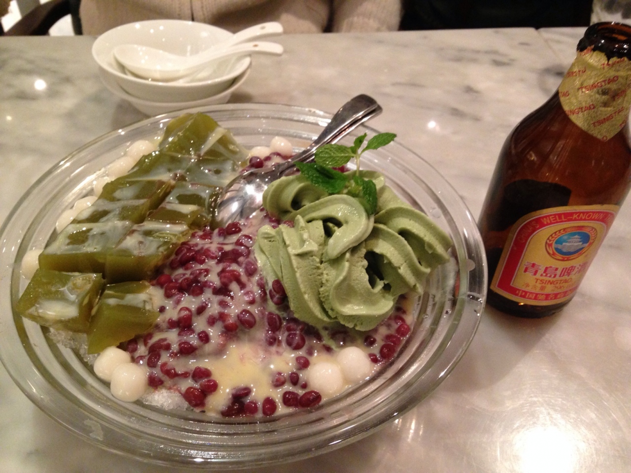 アルコール類にはビールや中国酒以外にカクテルなどもあり、ピニャコラーダを頼んでみました。カキの天ぷら、魚の甘酢あんかけ、鳥のごま油煮、魯肉飯、デザートにかき氷を注文。メニューはどれも写真がついているので選びやすいです。どれも濃すぎず食べやすいお味でいくらでも入りますが、2人ではかなりのボリュームの多さでした。お値段もなかなかお手頃です。台湾料理のレストランではデザートの種類が豊富なので何か食べずにはいられません。この時も最初はピーナツかき氷を食べようと思っていたら、今日は作れないと言われてしまい、仕方なく抹茶味のかき氷にしたらまぁ普通でした。