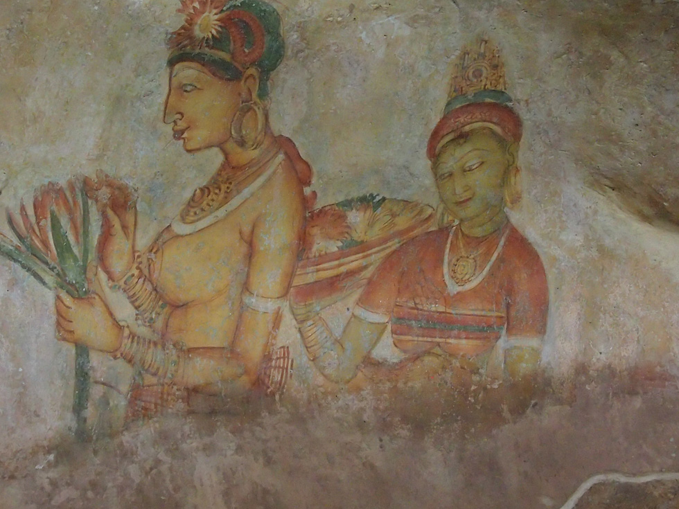 そのそそり立つ大きな岩自体みごとなもでした。そして岩の上に煉瓦積みの宮殿の後がありました。岩の途中にはきれいな色彩の女性の絵が描かれていました。この岩山に宮殿を建てた王様が描いたということです。