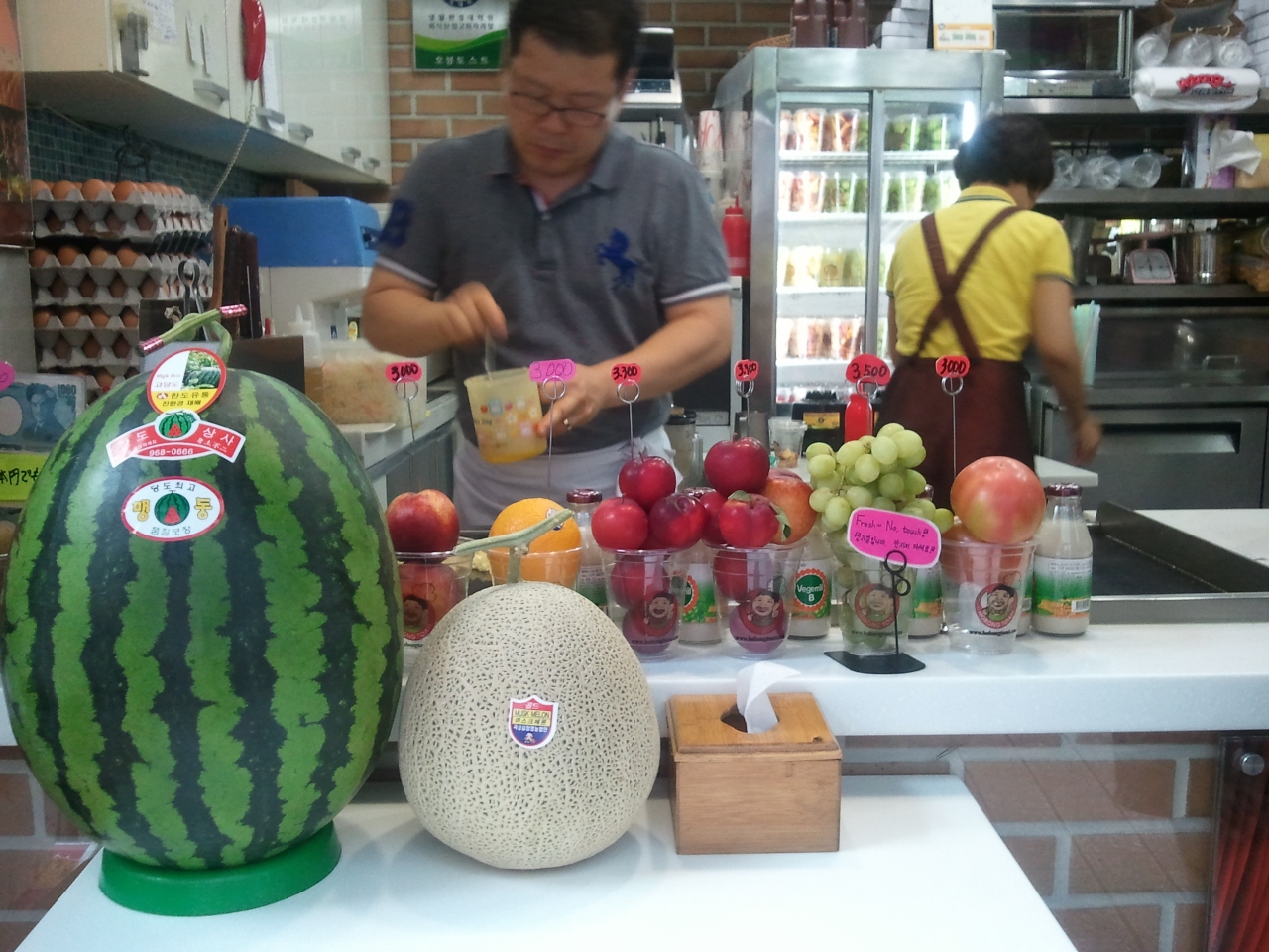 個人的にはスモモジュースが本当においしくて大好きなんですが、店頭においしそうな果物が沢山並んでいるので目移りしてしまいます。トーストは独特の甘めのたれが病みつきになって癖になります!ソウルへたびたびいらっしゃる方はポイントカード作っておくといいですよ!(10個?で一つ無料だったかな??)