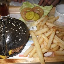 遅めのランチには間に合わず、17時過ぎに行きました。N@chan!バーガーをオーダー。二人で半分づつカットし、食べました。バンズが真っ黒でおいしいのかなぁて思ったけど、パテが美味しい!半分でも私にはお腹いっぱいになったけど、このハンバーガーはもう一度食べたい。