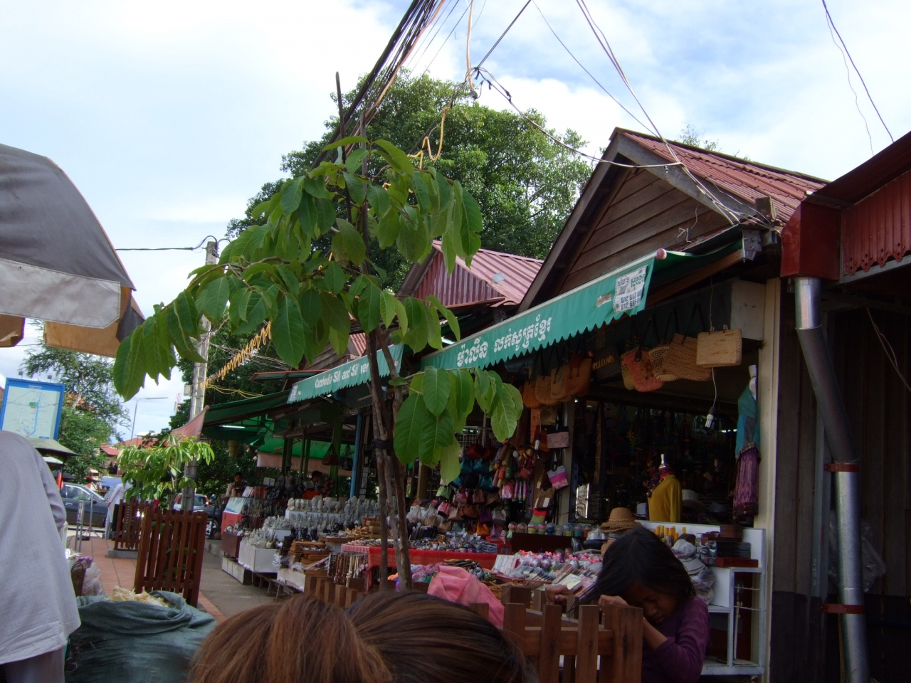 ここで売られている雑貨のほとんどは中国製のようです。ガイドがそういっていました。カンボジア製の製品がほしければ、別のところで買ったほうがよいです。売りに出される鶏がたくさん台車につるされていたり、屋台がでていたりと活気がありました。サトウキビのジュースを飲んでみたかったのですが、おなかを壊す確立が高いといわれたのでやめました。生のものでなければ、問題ないと思います。