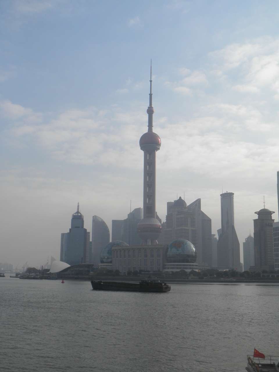 中国の上海市を散策しているうちに、外灘の歴史ありそうなところにたどり着きました。 大きな河の黄浦江の河岸は散策路になっていて、多くの観光客が散策していました。 対岸には、特徴的な姿の東方明珠塔(東方テレビタワー)が眺められました。 それにしても、スモッグがすごくてなんでもけぶって見えました。