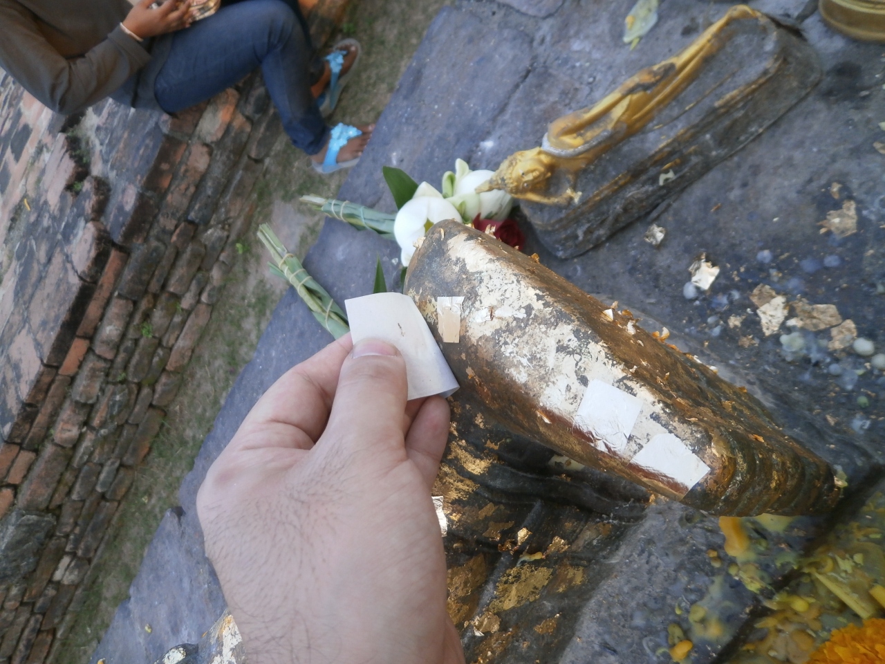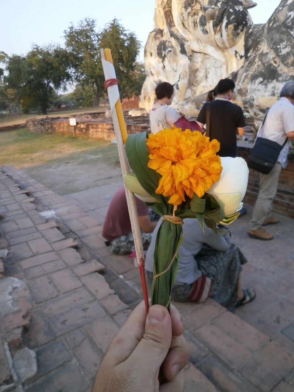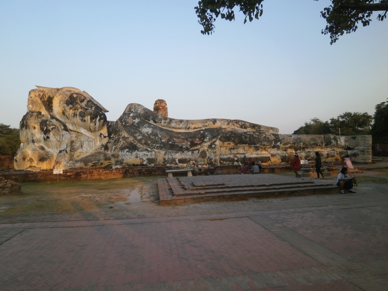 高さ5m、全長28mある大きな涅槃仏です。1351年にアユタヤ王朝が開かれ400年を超える栄華の時代を築いていたのですが、1767年のビルマ軍との戦争の影響で、破壊されました。ビルマ軍の攻撃に遭い、寺院の建物が徹底的に破壊されたようです。ですが、この涅槃仏だけは残されたようです。