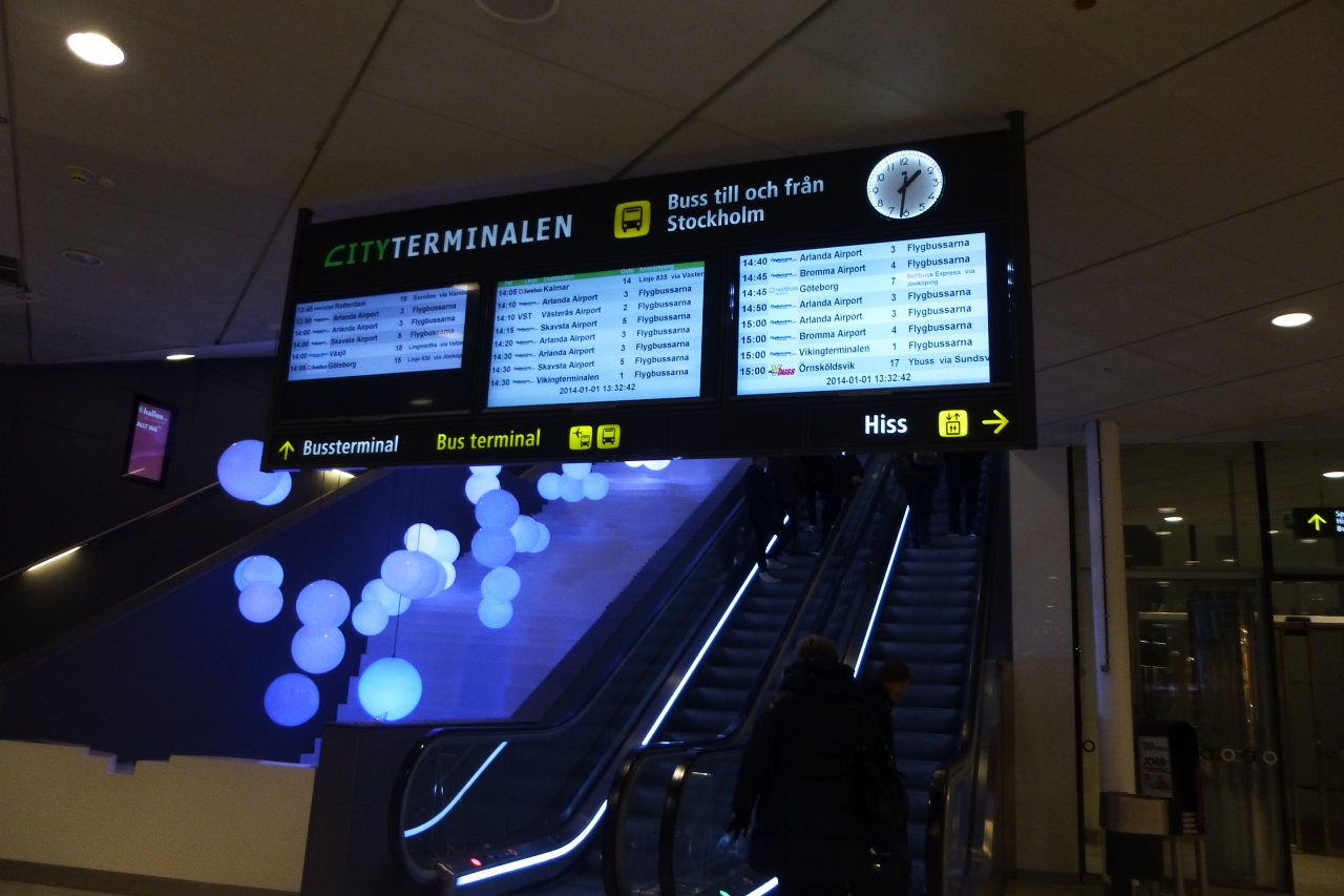 アーランダー空港からセントラルステーションまでは鉄道もあるようですが、空港バスのほうがちょっとは安いです。アーランダ空港まではFlygbussarnaという会社のバスが運行しており、チケットはインフォメーションや券売機で購入できます(バスの中では購入できないです)。金額は片道SEK99です。往復で購入しても割引はありません。インフォメーションなどでバスのタイムテーブルはもらえますが、15分~に1本程度はでているのでけっこう便利です(時間帯にもよります)。