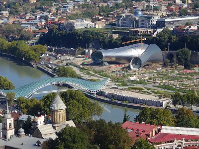 グルジアの母の像からの景観です。真ん中に見えるのが、「平和の橋」。 夜、高台のレストランから『見たときには、きれいにライトアップされていました。こうして昼間に見るのもまたいいです。この街が、ムトゥクヴァリ川を中心に発展していった街だな、ということがよくわかります。