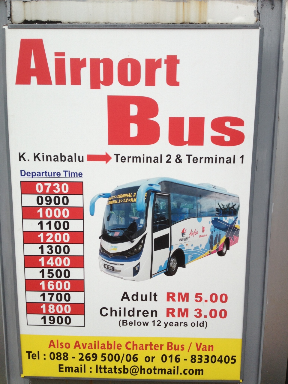コタキナバル空港第一・第二ターミナルから市内へ行けます。バスは古いタイプのものに当たると、アジアらしいボロボロバスですが、新車だとテレビも映るきれいなバスでした。空港からはチケット売り場で切符を買って乗車します。大きな看板があるのですぐにわかります。(空港の規模も大きくはありません)